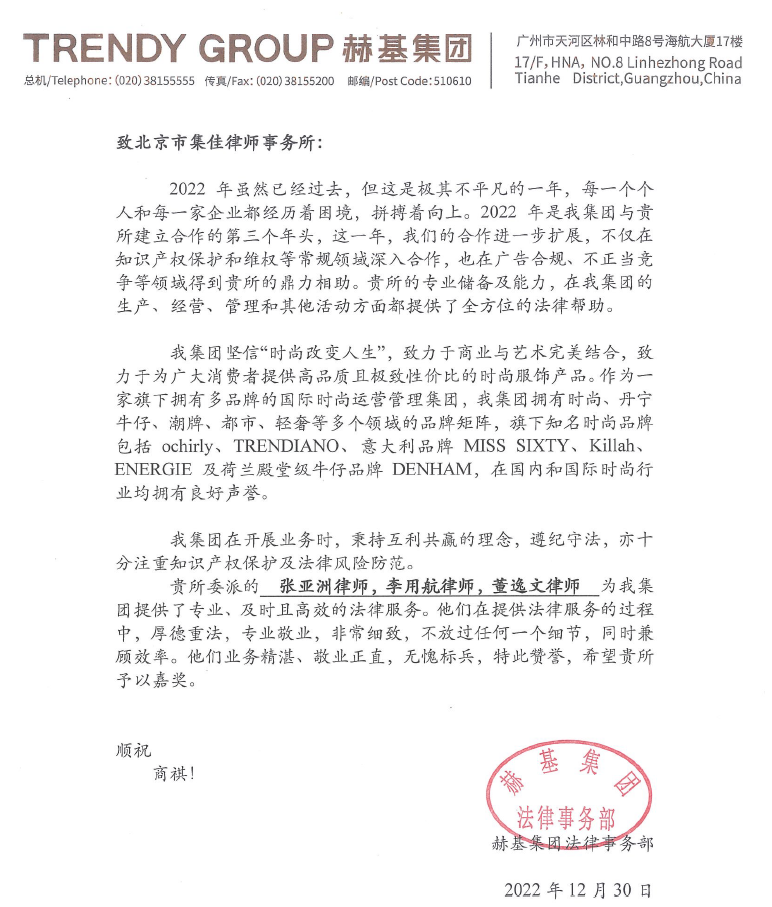 新年早々、集佳は顧客の赫基集団から心溫まる稱賛の書簡を受領(lǐng)した。書簡では、知財保護(hù)と権利保護(hù)、広告コンプライアンス、不正競爭等の分野における集佳の優(yōu)れたサービスと確かな業(yè)務(wù)が高く認(rèn)められ、また張亜洲、李用航、董逸文、常寶亮、代健、馬偉風(fēng)らの専門スタッフの真面目で責(zé)任感あふれる仕事ぶりが高く評価され、法務(wù)サービスを提供する中での彼らの人徳の高さや法律重視の姿勢、専門性、効率の良さ、勤勉さ、誠実さを稱賛し、模範(fàn)労働者の名に恥じないと讃えている。