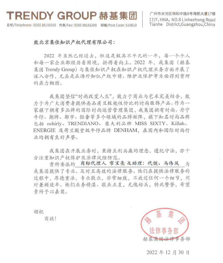 集佳の優(yōu)れたサービスが顧客の赫基集団(Trendy Group)から再度稱賛される |