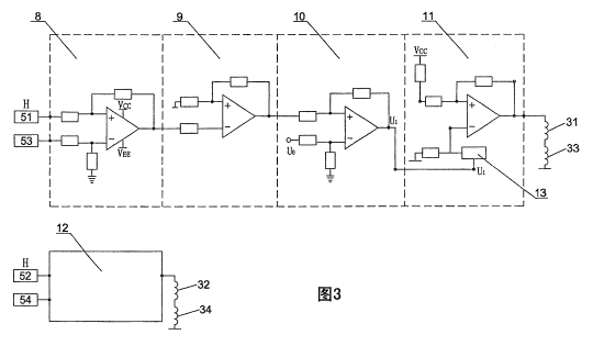 而涉案專利說明書給出了唯一的“具體實(shí)施方式”,即:懸浮體水平運(yùn)動(dòng)控制裝置包括:①帶鐵芯的四個(gè)線圈31、32、33、34;②四個(gè)霍爾元件傳感器(磁性傳感器)51、52、53、54,分成兩組分別控制兩組線圈,進(jìn)而控制懸浮體X、Y方向的自由移動(dòng);③在底座內(nèi)還設(shè)置有控制電路板6,由完全相同的相對(duì)獨(dú)立的控制電路12組成;④控制電路12也僅僅給出一個(gè)具體實(shí)施方式,即傳感器電壓接入減法電路8(檢測(cè)電壓值),經(jīng)放大電路9(信號(hào)放大),與減法電路10的基準(zhǔn)電壓U0進(jìn)行比較,輸出到功放電路;當(dāng)輸出電壓不為0時(shí),進(jìn)行勵(lì)磁電流的調(diào)整。如下圖:
