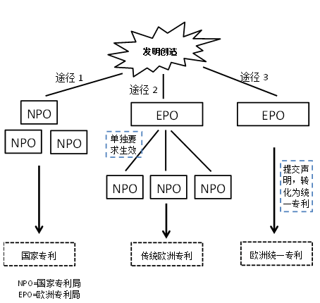 為了簡(jiǎn)化專利申請(qǐng)的流程和統(tǒng)一專利審批的標(biāo)準(zhǔn),歐洲各國(guó)簽訂了歐洲專利公約(EPC)并建立了歐洲專利局(EPO)。申請(qǐng)人可以直接向EPO遞交專利申請(qǐng),在EPO授權(quán)后分別在感興趣的國(guó)家生效其專利。下文中我們稱這種類型的專利為“傳統(tǒng)歐洲專利”。此種申請(qǐng)途徑我們稱之為途徑2。