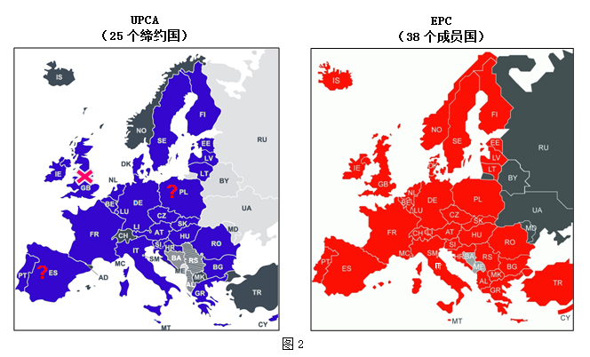 值得注意的是,英國(guó)盡管在2018年4月批準(zhǔn)了該協(xié)議,但是由于脫歐,目前英國(guó)已退出UPCA。另外,有些歐洲國(guó)家如瑞士、挪威、冰島等并非歐盟成員國(guó),所以也沒(méi)有加入U(xiǎn)PCA。而典型地,歐洲專利公約EPC的成員國(guó)如土耳其也不能加入U(xiǎn)PCA。下面的圖二對(duì)比了EPC成員國(guó)和預(yù)期UPCA締約國(guó)的覆蓋范圍。其中,在UPCA的地圖中,灰色顯示的國(guó)家是非歐盟成員國(guó)同時(shí)也不能加入U(xiǎn)PCA,叉號(hào)表示的英國(guó)已經(jīng)脫歐且退出UPCA,問(wèn)號(hào)表示的西班牙和波蘭目前沒(méi)有意愿加入U(xiǎn)PCA,但是隨時(shí)可能加入。