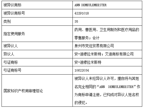 國家知識產(chǎn)權(quán)局經(jīng)審理本案認(rèn)為:被異議商標(biāo)“ANN DEMEULEMEESTER”指定使用于第35類“藥用、獸醫(yī)用、衛(wèi)生用制劑和醫(yī)療用品的零售服務(wù);會計(jì)”等服務(wù)上。異議人引證在先注冊的第10622034號“安?迪穆拉米斯特”等系列商標(biāo)核定使用于第35類“商業(yè)場所搬遷;文秘;會計(jì)”等服務(wù)上。雖然雙方商標(biāo)指定使用的部分服務(wù)相近,屬于類似服務(wù),但雙方商標(biāo)文字構(gòu)成及整體外觀具有一定區(qū)別,未構(gòu)成近似商標(biāo),因此雙方商標(biāo)未構(gòu)成使用于類似服務(wù)上的近似商標(biāo)。本案中,異議人稱被異議人侵犯其姓名權(quán)并提供了如下證據(jù):異議人ANN DEMEULEMEESTER為世界知名時(shí)尚設(shè)計(jì)師,曾多次參加米蘭時(shí)裝周、巴黎時(shí)裝周等時(shí)尚頂級活動,同時(shí)異議人創(chuàng)辦的同名品牌“ANN DEMEULEMEESTER”在倫敦、巴黎、東京、香港、上海等地均有其專賣店,并在相關(guān)公眾中獲得了一定的影響力。上述證據(jù)可證明:異議人ANN DEMEULEMEESTER在時(shí)尚行業(yè)內(nèi)已具有一定知名度,為相關(guān)公眾所知曉。此外,ANN DEMEULEMEESTER獨(dú)創(chuàng)性極高,并非常見的外國姓名,且被異議商標(biāo)“ANN DEMEULEMEESTER”是普通字體的純英文商標(biāo),與異議人姓名在字母組成及呼叫上完全相同。被異議人未經(jīng)異議人許可,擅自將與其姓名完全相同的“ANN DEMEULEMEESTER”作為商標(biāo)申請注冊,已構(gòu)成對異議人姓名權(quán)的侵犯。