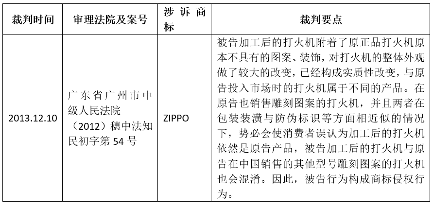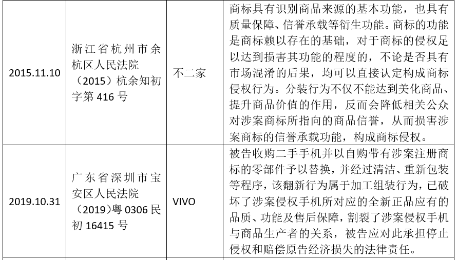 在最高人民法院就上述案件再審作出裁定前,已存在多份判決將此類行為認定為構成商標侵權的案例,部分還入選當?shù)胤ㄔ旱哪甓仁笾R產(chǎn)權保護案件。如,廣東省廣州市中級人民法院審結的“ZIPPO打火機”案【(2012)穗中法知民初字第54號】;浙江省杭州市余杭區(qū)人民法院審結的“不二家糖果”案【(2015)杭余知初字第416號】,該案入選“2015年浙江法院十大知識產(chǎn)權保護案件”;廣東省深圳市寶安區(qū)人民法院審結的“VIVO手機”案【(2019)粵0306民初16415號】;江蘇省蘇州市中級人民法院審結的“美的洗衣機”案【(2018)蘇05民初1020號】等。以下通過列表的形式展示相關參考信息: