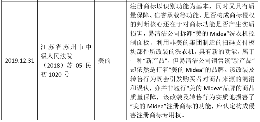 在廣州知識產(chǎn)權法院一審【(2016)粵73民初2529號】、廣東省高級人民法院二審【(2017)粵民終2659號】、最高人民法院再審【(2019)最高法民申4241號】的多米諾印刷科學有限公司(以下簡稱為“多米諾公司”)與廣州市杜高精密機電有限公司(以下簡稱為“杜高公司”)、廣州心可工業(yè)設計有限公司(以下簡稱為“心可公司”)侵害商標權糾紛案件中,從最高人民法院層面明確了此類案件的裁判規(guī)制,即:商品通過正常合法的商業(yè)渠道售出后,再行轉(zhuǎn)售的,通常不構成侵權。但是,如果商品在轉(zhuǎn)售過程中進行了實質(zhì)性改變,導致商品與來源之間的聯(lián)系發(fā)生改變,在該商品上繼續(xù)使用涉案商標且未對消費者履行合理告知義務的情況下,容易導致混淆并損害商標權人的利益,構成商標侵權。該案亦因其典型性,再審入選《最高人民法院知識產(chǎn)權案件年度報告(2020)》55件典型案件,二審入選“2018年廣東知識產(chǎn)權司法保護十大案件”。