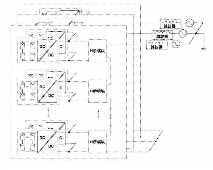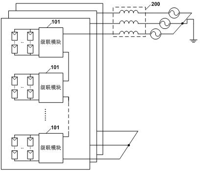 1、一種中高壓光伏發(fā)電系統(tǒng),其特征在于,包括三相濾波器和三個分別通過所述三相濾波器以星形或三角形接法實(shí)現(xiàn)連接的相電路,所述相電路中包括一個或者兩個串聯(lián)的橋臂,所述橋臂包括:至少一個級聯(lián)模塊、至少一個光伏組串和至少一個絕緣子,所述光伏組串包括多個光伏組件;所述橋臂中: