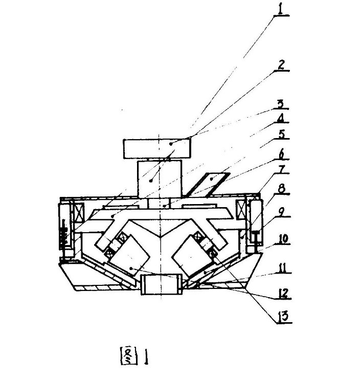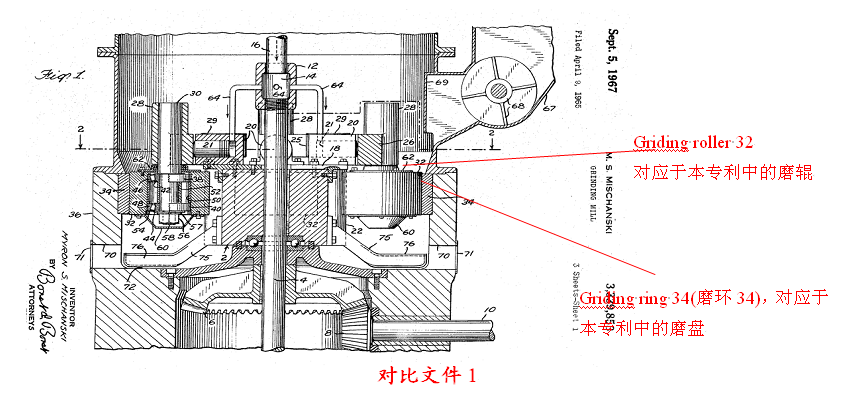 上述對(duì)比文件(雷蒙機(jī))的附圖中,其磨輥和磨盤兩者磨面的外輪廓線與地面垂直,且二者的軸心線平行。因此,磨輥與磨盤的相對(duì)位置關(guān)系僅為簡(jiǎn)單的內(nèi)外關(guān)系(完全內(nèi)側(cè)),也即是二者磨面的外輪廓線與軸心線均與地面垂直,并不存在上下關(guān)系。然而,在本專利的主要實(shí)施例中,磨輥與磨盤之間存在著上下關(guān)系,呈斜上方布置,參見下述該專利的附圖1: