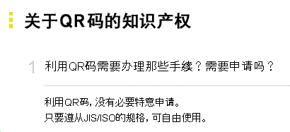 DENSO公司擁有QR Code二維碼的專利權(quán),但明確表示不會(huì)行使已形成標(biāo)準(zhǔn)(ISO/IEC 18004)的QR碼相關(guān)權(quán)利2。