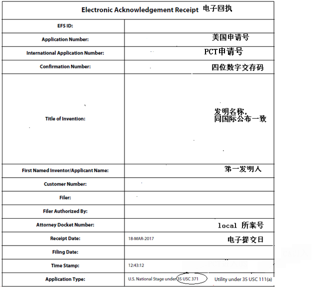 應(yīng)核查電子回執(zhí)中的基本信息,并通過(guò)核查電子回執(zhí)中的信息來(lái)判斷申請(qǐng)類型是否正確。以下是對(duì)電子回執(zhí)的摘錄說(shuō)明,供參考。從該摘錄說(shuō)明中可看出,當(dāng)Application Type顯示為 U.S.National stage under 35 U.S.C. 371時(shí),則說(shuō)明該美國(guó)申請(qǐng)是PCT進(jìn)入美國(guó)國(guó)家階段的申請(qǐng);當(dāng)Application Type顯示為 Utility under 35 U.S.C. 111(a)時(shí),則說(shuō)明該美國(guó)申請(qǐng)是PCT進(jìn)入美國(guó)國(guó)家的申請(qǐng)(就整體而言,也可能是巴黎公約申請(qǐng),但本節(jié)主要針對(duì)PCT進(jìn)入美國(guó)介紹)。