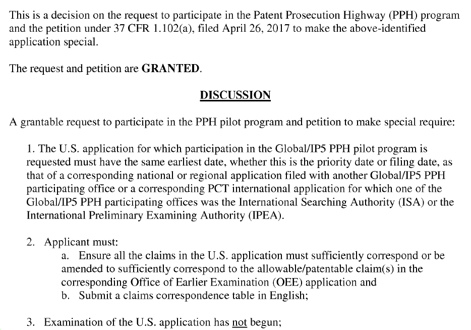 專利審查高速公路(簡(jiǎn)稱PPH)是在美國(guó)專利申請(qǐng)中常用的加快審查途徑。USPTO是在后申請(qǐng)的審查局,且作為在先申請(qǐng)的審查局經(jīng)過(guò)審查程序認(rèn)為受理的對(duì)應(yīng)申請(qǐng)包含至少一項(xiàng)可被授權(quán)或具有可專利性的權(quán)利要求,那么申請(qǐng)人可以向USPTO 請(qǐng)求參與PPH 項(xiàng)目。
