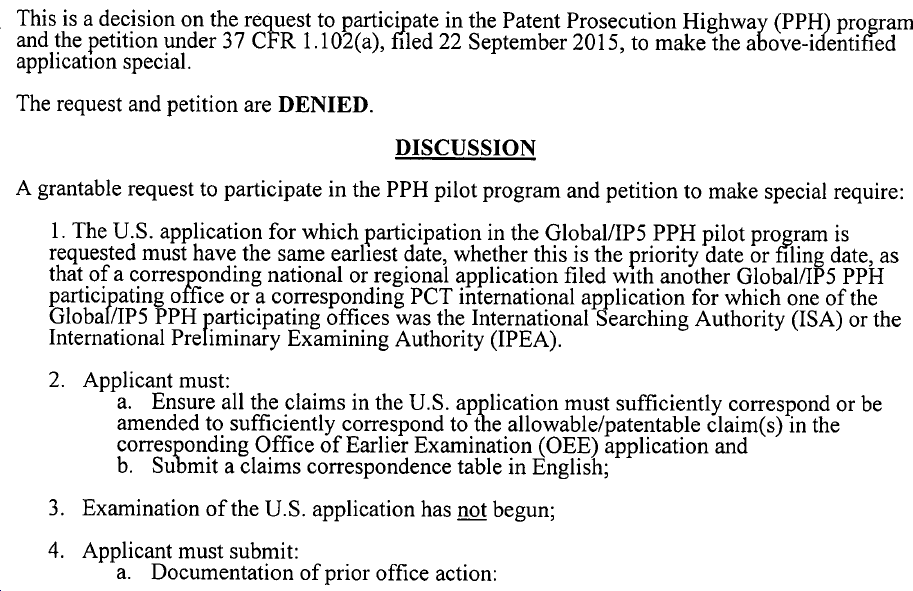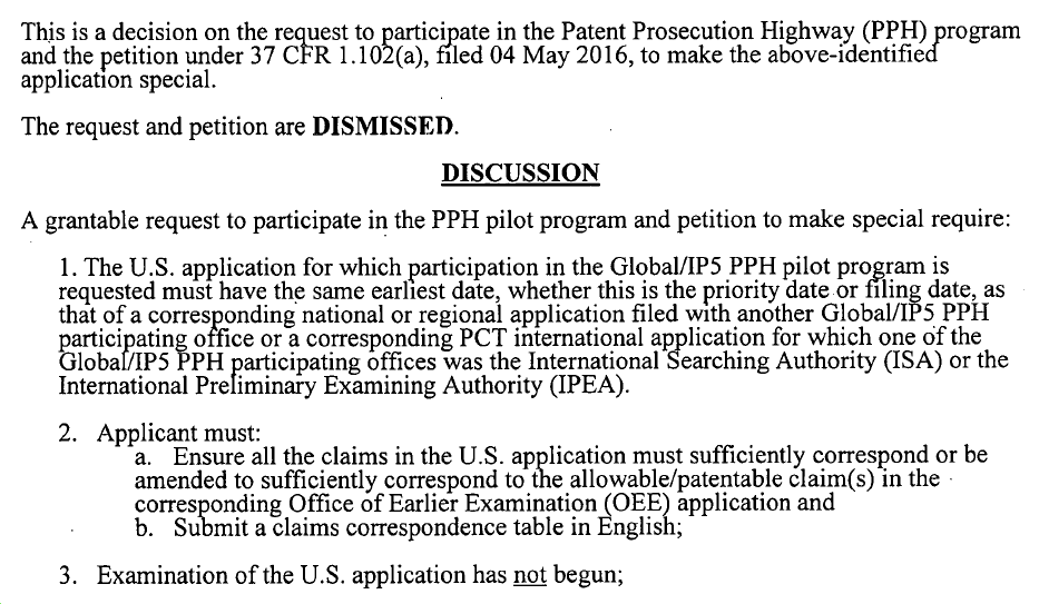 c)PPH拒絕通知(摘錄示例如下圖): 該通知是告知類通知。告知申請(qǐng)人PPH請(qǐng)求被拒絕。 該通知通常是因PPH請(qǐng)求未滿足時(shí)機(jī)要求(即審查員已開(kāi)始審查)而產(chǎn)生。