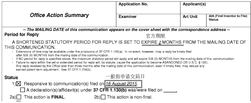 (1)情形1、申請(qǐng)人于FR發(fā)文日起的2個(gè)月內(nèi)完成答復(fù),審查員在3個(gè)月答復(fù)期內(nèi)發(fā)出AA,若AA答復(fù)日晚于3M法定期限,則延期自3M法定期限起算。
