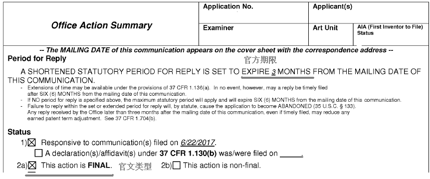 審查員在NR之后發(fā)出的最終審查意見(jiàn)通知書(shū),F(xiàn)R的官方答復(fù)期限為FR發(fā)文日起的三個(gè)月內(nèi)。