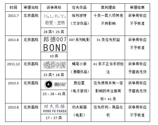 對(duì)于這種權(quán)利沖突類型,最初因缺少明確的法律規(guī)制,對(duì)在先作品名稱不予保護(hù)的情況并不少見(jiàn);但隨著遏制惡意搶注的加強(qiáng),商標(biāo)禁注的“絕對(duì)條款”開(kāi)始被適用,比如援引“其他不良影響”條款不予注冊(cè)的“哈里波特”,再比如援引“不正當(dāng)手段搶注”條款不予注冊(cè)的“蠟筆小新”。但用“絕對(duì)條款”保護(hù)相對(duì)權(quán)利畢竟有些名不正言不順,北京高院藉由“邦德007”、“功夫熊貓”兩案,首次將在先影視作品名稱、角色名稱作為在先權(quán)益進(jìn)行保護(hù),引導(dǎo)適用“相對(duì)條款”而不是“絕對(duì)條款”來(lái)解決這種沖突。在此期間,也有類似“奧拉星”的案件,適用“在先使用并有一定影響的未注冊(cè)商標(biāo)”條款來(lái)保護(hù)在先游戲名稱。本文附表一總結(jié)了近年來(lái)北京法院在商標(biāo)授權(quán)確權(quán)類案件中保護(hù)在先各類作品名稱的情況,供讀者參考。