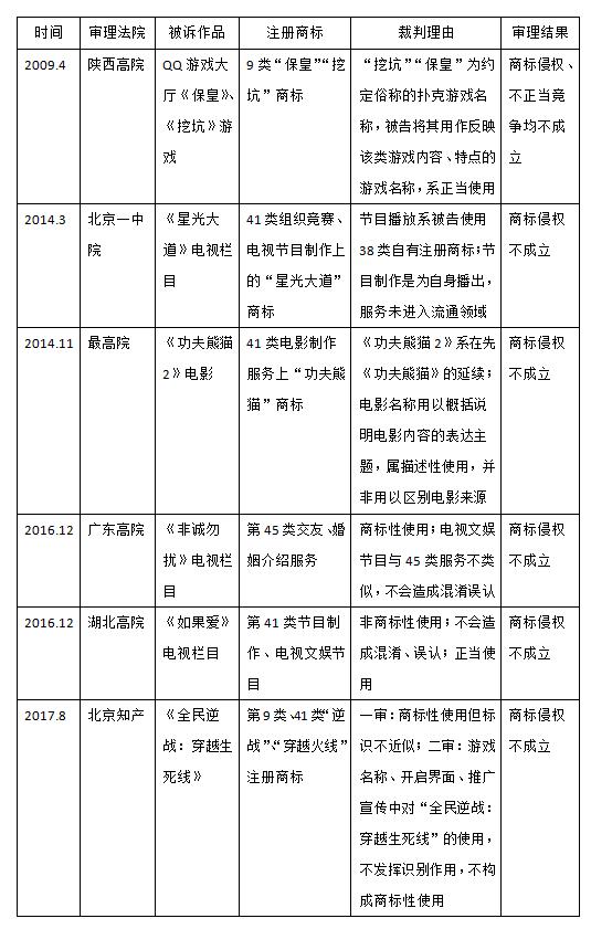 在已決案例中,一部作品的名稱——作品的類型無(wú)論是影視節(jié)目還是游戲——如果和在先注冊(cè)的商標(biāo)重合了,很少認(rèn)定商標(biāo)侵權(quán)成立的,理由大概有三種:第一,作品名稱并非商標(biāo)性使用,比如被訴侵權(quán)的《功夫熊貓》電影、《如果愛(ài)》電視欄目、《全民逆戰(zhàn)——穿越生死線》游戲;第二,作品與在先注冊(cè)商標(biāo)核定的商品或服務(wù)不類似,比如被訴侵權(quán)的《星光大道》電視欄目、《非誠(chéng)勿擾》電視欄目;第三,在先注冊(cè)商標(biāo)標(biāo)識(shí),相對(duì)于作品的內(nèi)容、主題等特點(diǎn)來(lái)說(shuō)具有直接的描述性,不能禁止他人正當(dāng)使用,比如被訴侵權(quán)的《挖坑》、《?;省酚螒颉I唐奉愃茊?wèn)題和正當(dāng)使用問(wèn)題,涉及到商標(biāo)標(biāo)識(shí)及作品的諸多具體細(xì)節(jié),個(gè)案性很強(qiáng);但商標(biāo)性使用問(wèn)題,幾乎是所有涉及這類沖突的案件中難以繞開(kāi)的爭(zhēng)議焦點(diǎn)。本文附表二,總結(jié)了各地法院對(duì)此類案件的審理情況。