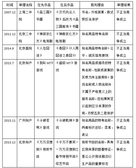 如上所述,這種沖突類型實(shí)際上是比較典型的仿冒之訴。這種沖突發(fā)生在同類作品之間,與發(fā)生在同類商品或服務(wù)之間,并沒(méi)有實(shí)質(zhì)上的區(qū)別。此類案件審理的難點(diǎn)在于,能否把原告主張的影視名稱、游戲名稱等作品名稱作為反不正當(dāng)競(jìng)爭(zhēng)法第五條第二項(xiàng)下的“知名商品的特有名稱”進(jìn)行保護(hù)。在武漢華旗訴光線傳媒、徐崢《泰囧》一案中,法院同時(shí)適用了反法第五條第二項(xiàng)和第二條公平、誠(chéng)實(shí)信用原則條款,以第二條原則性條款來(lái)補(bǔ)強(qiáng)適用第五條第二項(xiàng)稍顯牽強(qiáng)的缺憾;在北京知識(shí)產(chǎn)權(quán)法院審理的《我叫MT》一案中,法院也注意到“游戲名稱或人物名稱并不屬于嚴(yán)格意義上的服務(wù)名稱”,但認(rèn)為可以將“知名商品/服務(wù)名稱”擴(kuò)大到游戲名稱、人物名稱,條件是“其足以起到區(qū)分來(lái)源的作用”。本文附表四總結(jié)了此類案件的審理情況,供讀者參考。