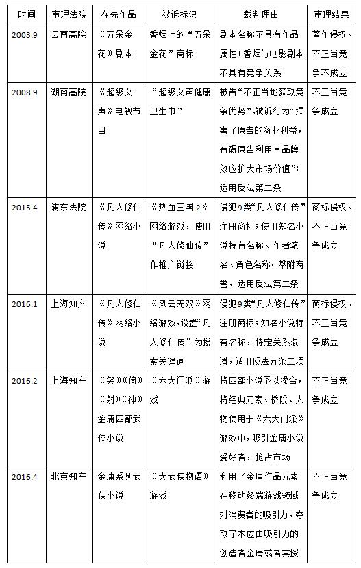 這種類型的案件目前數(shù)量不多,但可以預(yù)見(jiàn),將文化轉(zhuǎn)化為商業(yè)力量已經(jīng)是文化傳媒產(chǎn)業(yè)的大趨勢(shì),隨之而來(lái)的類似案件將會(huì)急劇增加。從已決的案件結(jié)果看,對(duì)于在先作品名稱的商業(yè)化利用問(wèn)題,司法判決已經(jīng)從不保護(hù)逐漸轉(zhuǎn)向保護(hù);在法律適用方面,較多的案例引用反不正當(dāng)競(jìng)爭(zhēng)法第二條的一般條款進(jìn)行判決,也存在個(gè)案適用反不正當(dāng)競(jìng)爭(zhēng)法第五條第二項(xiàng)。筆者認(rèn)為,將他人在先作品名稱作為自身商品或服務(wù)的標(biāo)識(shí)使用,確實(shí)可能會(huì)使人誤認(rèn)為該商品或服務(wù)與作品權(quán)利人之間存在授權(quán)許可、合作等特定關(guān)系,但這種認(rèn)知不同于商品或服務(wù)來(lái)源的混淆,與反法仿冒意義上的混淆、誤認(rèn)還是存在明顯區(qū)別。何況,反法第五條的保護(hù)范圍通常是在類似商品或服務(wù)的范圍之內(nèi),將這一條款擴(kuò)大適用到作品的衍生商品或服務(wù)范圍,稍顯牽強(qiáng)。因此,在反法第五條修改之前,適用第二條一般性條款似乎更為適當(dāng)。本文附表五總結(jié)了此類案件的審理情況,供讀者參考。