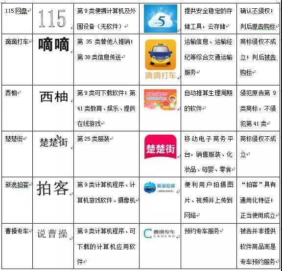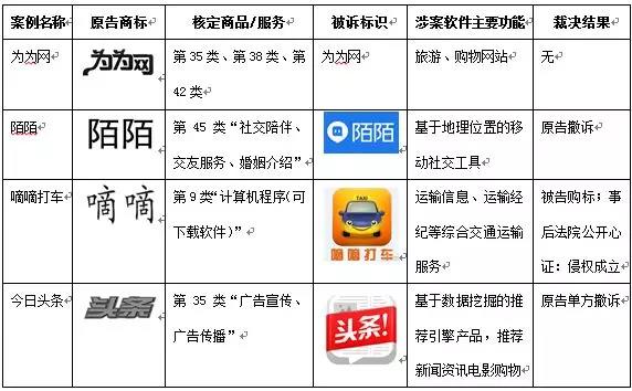 2014年8月上海市第一中級(jí)人民法院受理的上海易飾嘉網(wǎng)絡(luò)科技有限公司起訴上海沃商信息科技有限公司推出、蘋(píng)果APP Store分發(fā)的“為為網(wǎng)”APP侵害其第35類(lèi)、38類(lèi)、42類(lèi)服務(wù)上注冊(cè)的“為為網(wǎng)”商標(biāo),索賠人民幣1億元,被業(yè)內(nèi)稱(chēng)為首例(實(shí)際上,立案時(shí)間晚于杭州中院“嘀嘀打車(chē)”一案)移動(dòng)互聯(lián)網(wǎng)商標(biāo)侵權(quán)糾紛,由于雙方和解或其他原因,該案并未有判決做出。同樣,2014-2015年間,杭州陌陌婚慶服務(wù)有限公司以其在45類(lèi)“社交陪伴、交友服務(wù)、婚姻介紹”等服務(wù)上注冊(cè)的“陌陌”商標(biāo),先后向北京市朝陽(yáng)區(qū)人民法院、北京知識(shí)產(chǎn)權(quán)法院起訴北京陌陌科技有限公司停止“陌陌”軟件的下載服務(wù)并索賠1100萬(wàn)元,后兩案均以原告撤訴結(jié)案。2014年5月,杭州妙影微電子有限公司、寧波市科技園區(qū)妙影電子有限公司訴北京小桔科技有限公司“嘀嘀打車(chē)”侵犯其第9類(lèi)“計(jì)算機(jī)程序(可下載軟件)”上注冊(cè)的“嘀嘀”商標(biāo),索賠經(jīng)濟(jì)損失人民幣8000萬(wàn),2015年5月杭州市中級(jí)人民法院開(kāi)庭審理了此案,2016年5月原告以適當(dāng)價(jià)格(據(jù)傳為人民幣300萬(wàn)元)將其注冊(cè)商標(biāo)一并轉(zhuǎn)讓給被告后,原告撤訴。2016年6月北京博天恒業(yè)廣告有限公司向北京市西城區(qū)人民法院起訴稱(chēng),北京字節(jié)跳動(dòng)科技有限公司、北京字節(jié)跳動(dòng)網(wǎng)絡(luò)技術(shù)有限公司手機(jī)端“今日頭條”APP的名稱(chēng)、圖標(biāo)以及PC端“頭條網(wǎng)站”侵犯其在第35類(lèi)“廣告宣傳、廣告?zhèn)鞑ァ鄙虾藴?zhǔn)注冊(cè)的“頭條”商標(biāo),要求停止侵權(quán)、消除影響,并索賠高達(dá)人民幣1億元的經(jīng)濟(jì)損失,2016年11月,原告單方撤訴[2]。目前,涉及APP的商標(biāo)侵權(quán)糾紛案件,可資借鑒的判例主要有2014年1月東莞市中級(jí)人民法院審理的“115網(wǎng)盤(pán)”一案[3],2015年2月北京市海淀區(qū)人民法院審理的“滴滴打車(chē)”一案[4],2015年12月北京知識(shí)產(chǎn)權(quán)法院審理的“西柚”一案[5],2016年8月北京市海淀區(qū)人民法院審理的“楚楚街”一案[6],2016年9月北京市高級(jí)人民法院再審結(jié)案的“新浪拍客”一案[7],2017年4月杭州濱江區(qū)法院一審的“曹操專(zhuān)車(chē)”一案;而杭州中院雖未就“嘀嘀打車(chē)”一案做出判決,但主審法官在其文章中[8]公開(kāi)了該案的審理思路,同樣具有重要的參考價(jià)值。