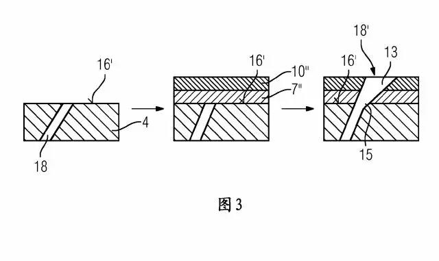 而本申請(qǐng)涉及的是一種重新制造具有擴(kuò)散器的貫通孔的方法,其用于新構(gòu)件。從圖3可知,首先在襯底4中加工出貫通孔18,此時(shí)在襯底4中并不具有擴(kuò)散器部分15;然后進(jìn)行覆層;最后制造擴(kuò)散器13,即首次為所述擴(kuò)散器13移除所述襯底4的擴(kuò)散器部分15中的附加的材料。也就是說,在覆層前在襯底4中并不具有擴(kuò)散器部分15。
