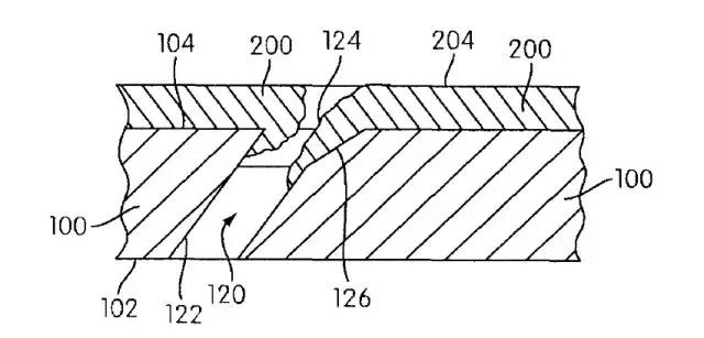 對(duì)比文件1教導(dǎo)的是一種再次敞開計(jì)量孔的方法,其用于舊構(gòu)件的翻新或再處理。也就是說,冷卻孔120的翼狀槽126(擴(kuò)寬部)在施加熱障涂層200之前就已經(jīng)存在于原有制品100中。這類似于本申請(qǐng)圖2中所示的現(xiàn)有技術(shù)。