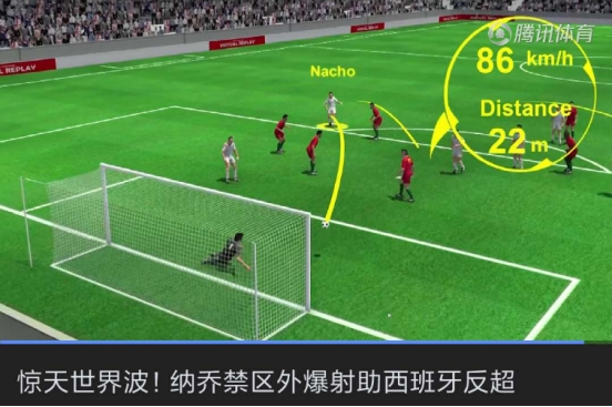 而對于沒有取得新媒體版權(quán)的一眾媒體平臺,以騰訊體育為例,筆者發(fā)現(xiàn)其在對世界杯賽事進行報道時采用動畫的形式還原精彩片段,并附加更多相關(guān)數(shù)據(jù),已屬變通方式中的優(yōu)選。