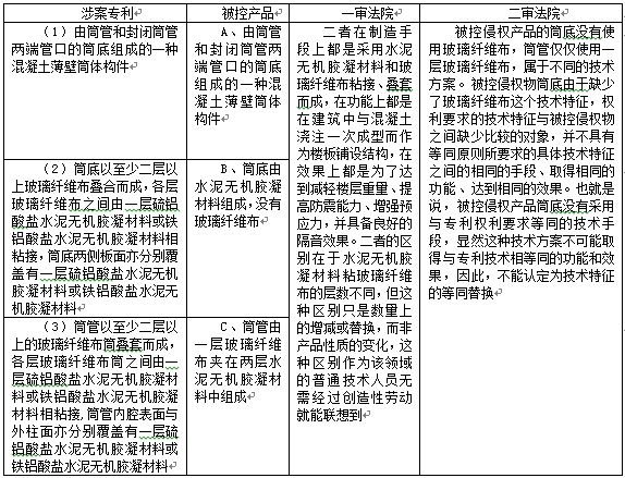 涉案專利權(quán)利要求所限定的“混凝土薄壁筒體構(gòu)件”與巨星南寧分公司生產(chǎn)的薄壁管件的技術(shù)特征特征比對(duì)如下。該案的焦點(diǎn)問(wèn)題在于,被控產(chǎn)品技術(shù)特征C與涉案專利技術(shù)特征(3)相比是否構(gòu)成等同特征的判斷。也就是說(shuō),被控產(chǎn)品筒體的“玻璃纖維布夾”是否為權(quán)利要求中記載的管玻璃纖維布層數(shù)為“不少于二層”為等同特征。