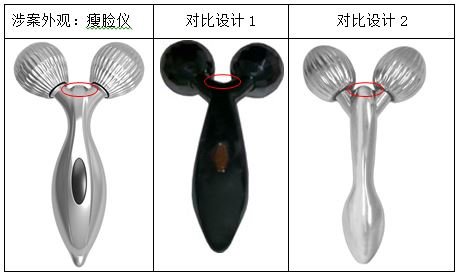 合議組認為,用于組合的對比設(shè)計特征應(yīng)當(dāng)是對比設(shè)計中具有相對獨立視覺效果的組成部分,是以一般消費者眼光可直接從對比設(shè)計中自然區(qū)分出來的部分。本案中,證據(jù)2的兩個按摩球中間的凸出部位實際上是手柄的頂部,證據(jù)2的手柄為一體構(gòu)成,該凸出部分屬于特意劃分、截取所得出的部分,不是一般消費者可直接從證據(jù)2中自然區(qū)分獲知的,不能作為設(shè)計特征加以組合。