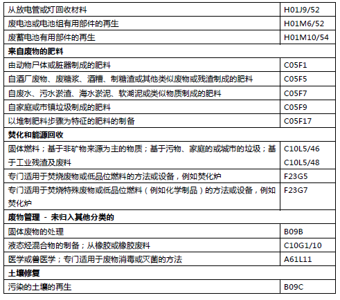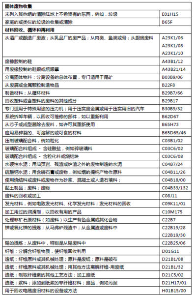 數(shù)據(jù)檢索在大為專利搜索進(jìn)行,考慮到技術(shù)代表性和樣本范圍,選取中國(guó)發(fā)明專利數(shù)據(jù)庫(kù),檢索條件根據(jù)經(jīng)濟(jì)合作與發(fā)展組織(OECD)環(huán)境相關(guān)問(wèn)題的專利檢索策略【4】,選取固體廢物(下文中簡(jiǎn)稱固廢)領(lǐng)域的相關(guān)IPC分類號(hào)進(jìn)行整理,結(jié)果如表1所示。