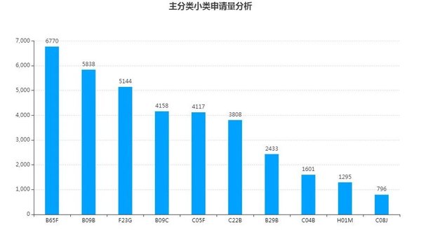 從固廢產(chǎn)業(yè)專利申請(qǐng)的技術(shù)分類看,熱點(diǎn)領(lǐng)域集中在B部(作業(yè)、運(yùn)輸)、C部(化學(xué)、冶金)和F部(機(jī)械工程等)。按申請(qǐng)量排序的小類為B65F(家庭的或類似的垃圾的收集或清除)、B09B(固體廢物的處理)、F23G(焚化爐;廢物或低品位燃料的焚毀)、B09C(污染的土壤的再生)、C05F(不包含在C05B、C05C小類中的有機(jī)肥料,如用廢物或垃圾制成的肥料)和C22B(金屬的生產(chǎn)或精煉)。這六類的申請(qǐng)量合計(jì)29835件,大約占據(jù)分析專利總量的80%左右。