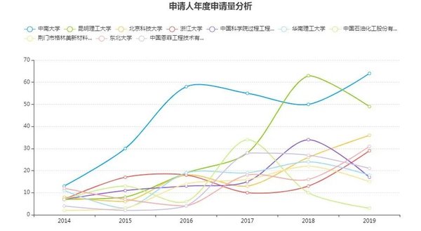 分年度看,如圖5,申請(qǐng)人在近些年的申請(qǐng)趨勢(shì)總體變化不大。其中中國(guó)石油化工股份有限公司的申請(qǐng)量在2017年達(dá)到高峰后,近兩年有所下降;而昆明理工大學(xué)在2017年之后、浙江大學(xué)和東北大學(xué)在2018年之后都有明顯的發(fā)力,這可能表明各個(gè)申請(qǐng)人在相應(yīng)領(lǐng)域的研發(fā)成果有所波動(dòng),其更深的后果有待更多觀察。