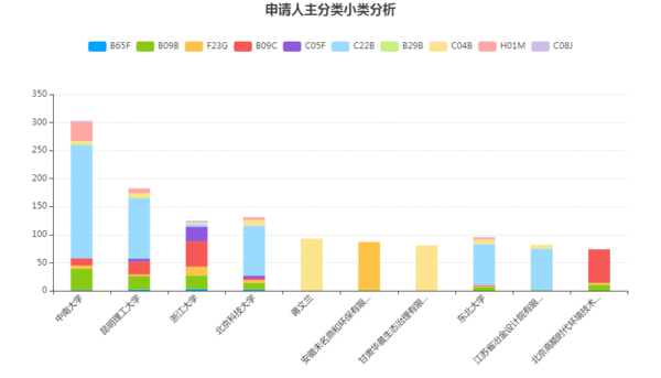 安徽未名鼎和環(huán)保有限公司的申請(qǐng)全部為F23G(焚化爐;廢物或低品位燃料的焚毀),這和該公司的主營(yíng)業(yè)務(wù)(生活垃圾熱解)保持一致。浙江大學(xué)、北京高能時(shí)代環(huán)境技術(shù)股份有限公司的專利申請(qǐng)以B09C(污染的土壤的再生)為主。值得注意的是,在本小節(jié)分析的十個(gè)主體中,浙江大學(xué)的技術(shù)分類分散程度最高,顯示出其在多個(gè)技術(shù)方向上的發(fā)展較為均衡,體現(xiàn)出較強(qiáng)的綜合實(shí)力。此外,據(jù)查詢,高能時(shí)代公司是土壤修復(fù)產(chǎn)業(yè)的龍頭公司,其在污染土壤的再生領(lǐng)域擁有較強(qiáng)的研發(fā)實(shí)力。