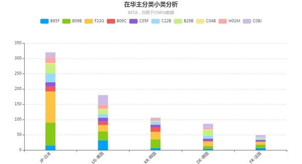 由上文可知,國(guó)外申請(qǐng)人在國(guó)內(nèi)固廢領(lǐng)域的布局較少,前五個(gè)布局國(guó)家各自的技術(shù)布局如圖7所示。由圖可知,除了日本存在兩個(gè)較明顯的優(yōu)勢(shì)小類布局之外,其余幾個(gè)國(guó)家的技術(shù)布局雖然各有側(cè)重,但均比較分散。與圖2相比,五個(gè)國(guó)外申請(qǐng)主體中只有美國(guó)以B65F(家庭的或類似的垃圾的收集或清除,其在分析專利總量中排名第一)為主,部分反映出美國(guó)企業(yè)在固廢收集方面的出海優(yōu)勢(shì)。還注意到,日本企業(yè)以F23G(焚化爐;廢物或低品位燃料的焚毀)和B09B(固體廢物的處理)為主進(jìn)行布局,這與日本在垃圾焚燒和處理方面的技術(shù)成熟程度一致。