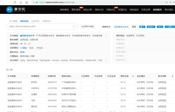 為此,筆者在摩知輪以“肽”為關(guān)鍵字檢索2020年包含“肽”的商標(biāo)駁回復(fù)審決定書,檢索結(jié)果顯示,截止2020年12月3日,共計出現(xiàn)包含“肽”的商標(biāo)駁回復(fù)審決定書82件,其中80件予以駁回,僅2件通過行政訴訟予以初步審定并公告。在82份駁回復(fù)審決定中,71件以《商標(biāo)法》第十條第一款第(七)項“帶有欺騙性,容易使公眾對商品的質(zhì)量等特點或者產(chǎn)地產(chǎn)生誤認(rèn)的”條款駁回。