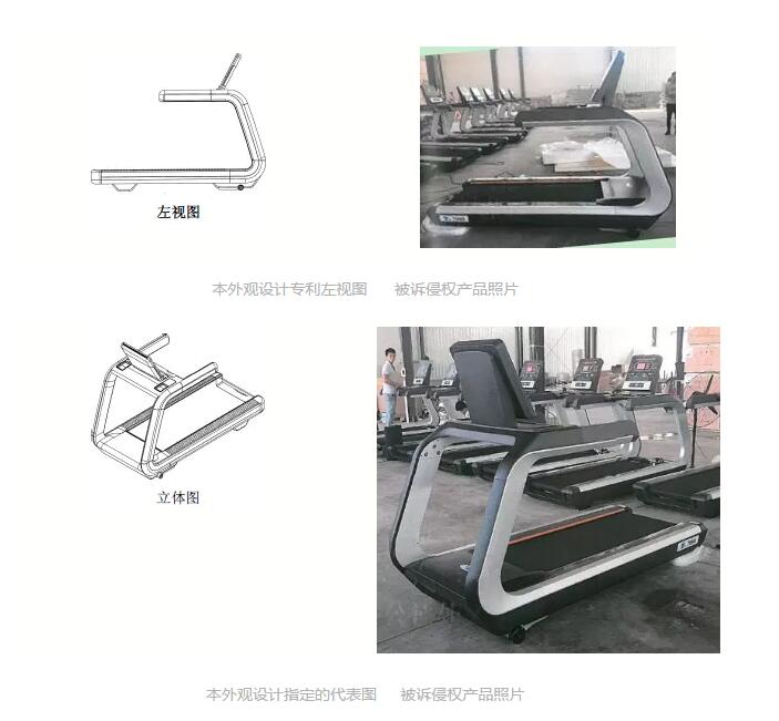 原告經(jīng)調(diào)查發(fā)現(xiàn),被告持有用于制造涉案侵權(quán)產(chǎn)品TZ-7000跑步機(jī)的專用設(shè)備、模具,并在其工廠內(nèi)大量制造、組裝、存儲(chǔ)TZ-7000跑步機(jī)產(chǎn)品,并通過互聯(lián)網(wǎng)大量銷售及許諾銷售上述侵權(quán)產(chǎn)品。鑒于此,原告泰諾健公司于2016年7月將被告天展公司訴至濟(jì)南中院,請(qǐng)求判令被告停止侵權(quán)行為,即停止制造、許諾銷售、銷售侵犯原告外觀設(shè)計(jì)專利權(quán)的跑步機(jī)產(chǎn)品,并賠償原告實(shí)際損失人民幣100萬元及合理維權(quán)費(fèi)用20萬元。被控侵權(quán)跑步機(jī)產(chǎn)品與涉案專利的外觀設(shè)計(jì)簡(jiǎn)單比對(duì)可參見下圖: