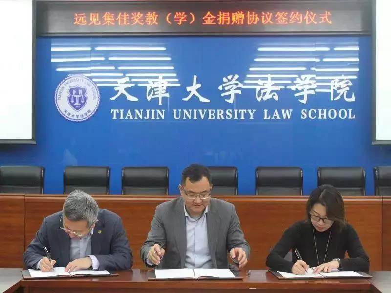 2018年12月29日,“天津大學(xué)法學(xué)院遠(yuǎn)見集佳獎(jiǎng)教(學(xué))金”捐贈(zèng)協(xié)議簽訂儀式在津舉行。中關(guān)村遠(yuǎn)見知識(shí)產(chǎn)權(quán)創(chuàng)新研究院理事長高巍,北京市集佳律師事務(wù)所主任李永波律師,天津大學(xué)校友與基金事務(wù)處處長潘峰、任杰老師和天津大學(xué)法學(xué)院院長孫佑海,副書記、副院長李明,郭貴雨老師等出席。