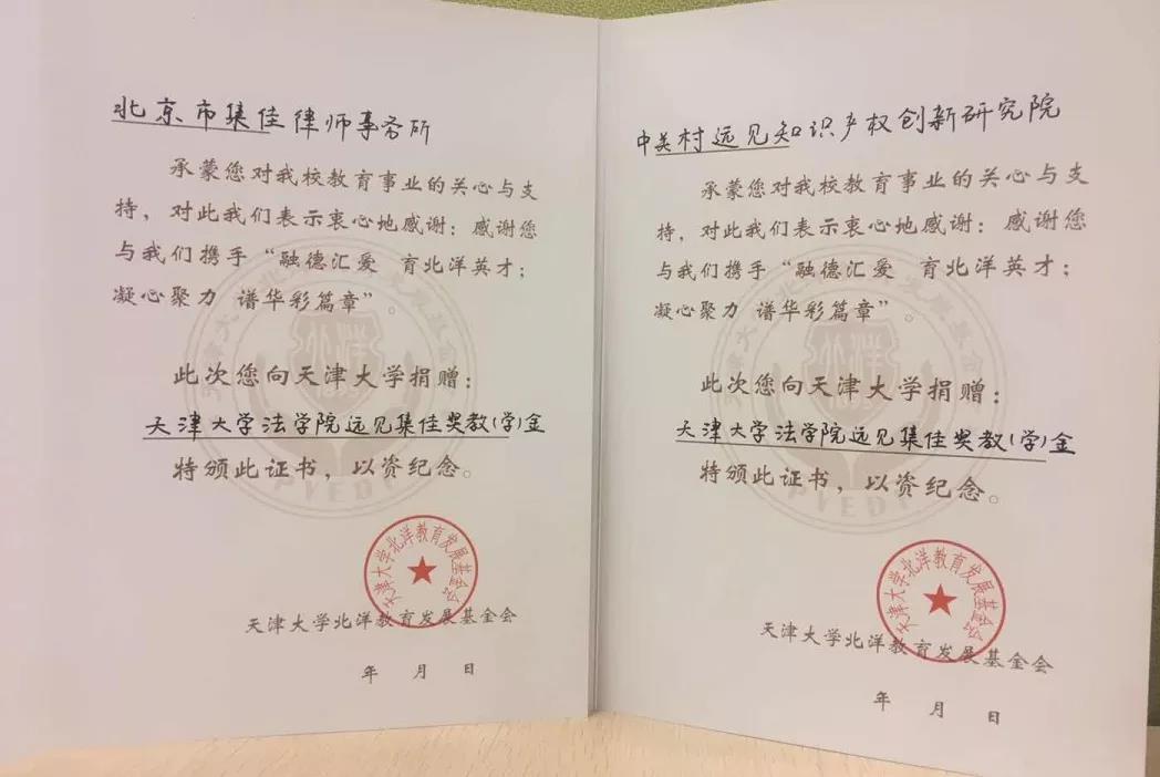 2019年1月中旬,天津大學(xué)北洋教育發(fā)展基金會(huì)又專程給集佳送來“捐資證書”,感謝集佳攜手遠(yuǎn)見創(chuàng)新研究院通過這一公益之舉,支持與資助天津大學(xué)的教育事業(yè)。