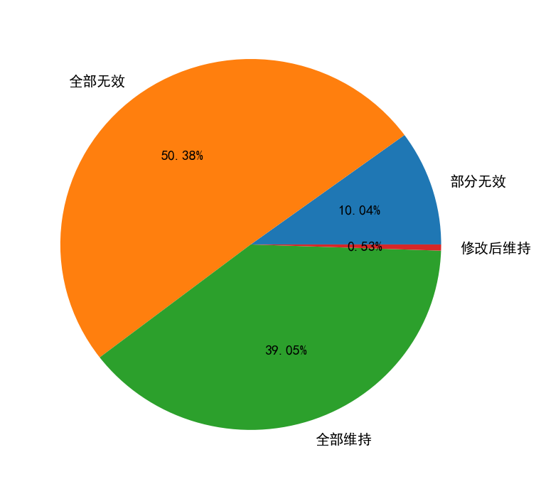 本次共收集專利無(wú)效宣告請(qǐng)求審查決定30178篇(至少有部分關(guān)鍵數(shù)據(jù)有效,包括2008年之前案件),其中宣告專利權(quán)全部無(wú)效(下簡(jiǎn)稱全部無(wú)效)的決定15203篇,占比50.4%,宣告專利權(quán)部分無(wú)效(下簡(jiǎn)稱部分無(wú)效)的決定3031篇,占比10.0%,宣告維持專利權(quán)有效(下簡(jiǎn)稱全部維持)的決定11783篇,占比39.0%,在修改的基礎(chǔ)上維持專利權(quán)有效(下簡(jiǎn)稱修改后維持)的決定161篇,占比0.5%??梢姡?strong>在超過(guò)60%的無(wú)效宣告請(qǐng)求中,都有至少部分權(quán)利要求被宣告無(wú)效。