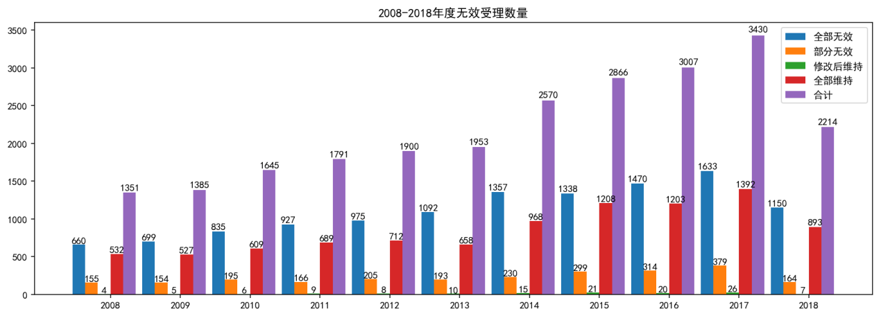 【2】需要說(shuō)明的是,復(fù)審委網(wǎng)站公開的數(shù)據(jù)本身存在一些問(wèn)題(例如個(gè)別決定存在信息缺失錯(cuò)誤等,尤其是早期發(fā)布的無(wú)效決定信息錯(cuò)誤較多),因此,筆者在統(tǒng)計(jì)過(guò)程中剔除了一些錯(cuò)誤或無(wú)法使用的數(shù)據(jù),并重點(diǎn)統(tǒng)計(jì)了2008年后近十年的數(shù)據(jù)??紤]到數(shù)據(jù)的剔除以及編寫的算法可能存在的不足,下面的統(tǒng)計(jì)結(jié)果會(huì)存在一定誤差。另外,考慮到無(wú)效決定都是已經(jīng)完結(jié)的案件,下面的全部統(tǒng)計(jì)分析都沒有包括尚處于無(wú)效程序中的案件。