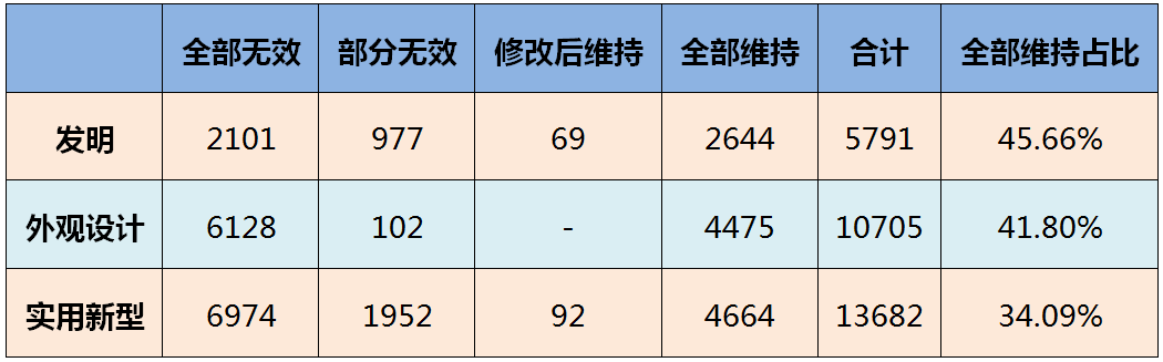 上表為按專利類型統(tǒng)計(jì)的各種情況的案件數(shù)量??傮w上看,發(fā)明專利宣告維持的比例要遠(yuǎn)高于外觀設(shè)計(jì)專利和實(shí)用新型專利,即專利被宣告無(wú)效的概率從發(fā)明專利到外觀設(shè)計(jì)專利再到實(shí)用新型專利是逐步增加的,這也與我們一般的認(rèn)識(shí)相符。某種程度上,實(shí)用新型專利的低穩(wěn)定性,大幅增加了專利整體被宣告無(wú)效的比例。