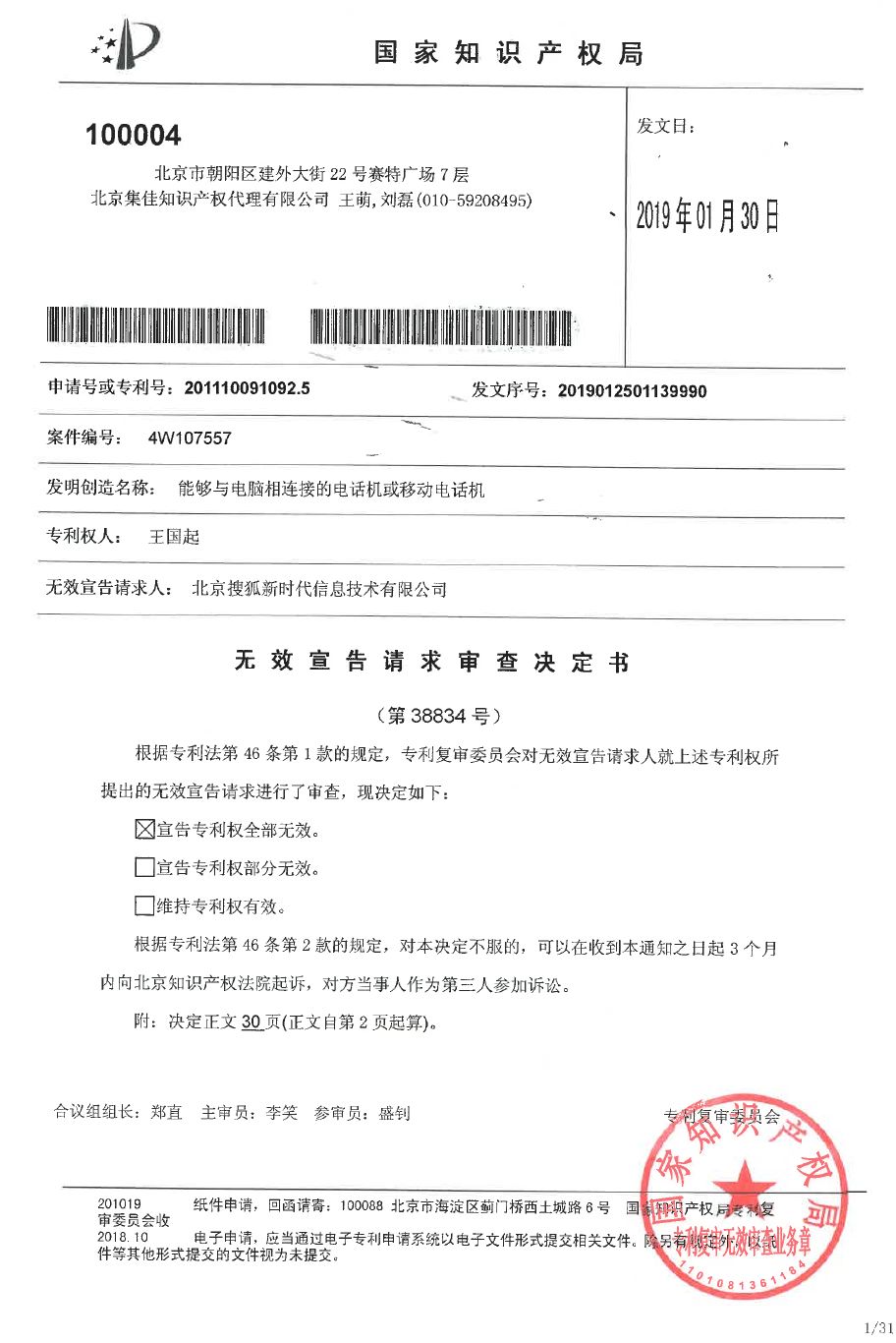 由于存在諸多特殊性,本案受到行業(yè)的高度關注。集佳公司接受搜狐公司委托,組建經驗豐富的專利無效團隊,團隊成員深知該案的重要性,以高標準嚴要求的態(tài)度認真對待無效過程中的每個環(huán)節(jié),從前期對比文件檢索,到無效請求材料的準備,證據的補充,以及后期的口頭審理,承委托人之信任,擔盡力成事之責任,終于實現(xiàn)了委托人搜狐的期望,在新年來臨之前,收到復審委做出的無效決定。