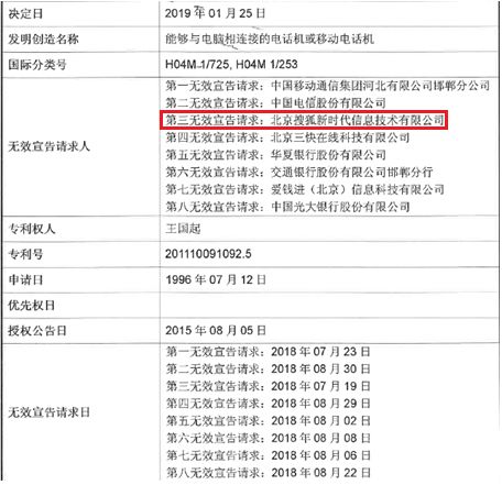 涉案專利名稱為“能夠與電腦相連接的電話機或移動電話機”,基于該專利,專利權人王國起自封“發(fā)漢字和圖像信息的電話機/移動電話機的全世界首創(chuàng)人”。2018年,王國起同時與中國移動、聯(lián)通、電信、搜狐、蘋果、華為、小米、錘子、農行、交行等等30余家企業(yè)發(fā)生專利侵權行政糾紛,涉案金額共計數(shù)十億元之多。