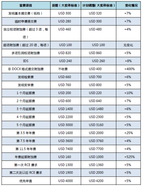 本次官費(fèi)調(diào)整計(jì)劃基本涵蓋各項(xiàng)官費(fèi),包括2018年1月實(shí)施的新官費(fèi)表中未調(diào)整的年費(fèi)、OA答復(fù)延期費(fèi)等,最大的調(diào)整包括專利訴訟請(qǐng)求費(fèi)上調(diào)25%,年費(fèi)遲交滯納金上調(diào)525%,外觀加速審查費(fèi)上調(diào)122%,新增非DOCX文件的提交費(fèi)。