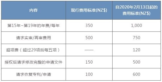自2020年2月13日起,新西蘭將執(zhí)行新的官費標(biāo)準(zhǔn),較為重要的費用調(diào)整包括:(1)引入超項費;(2)審查費用增加;(3)大大調(diào)高了維持費和續(xù)展費,尤其從第15年開始,詳見下表: