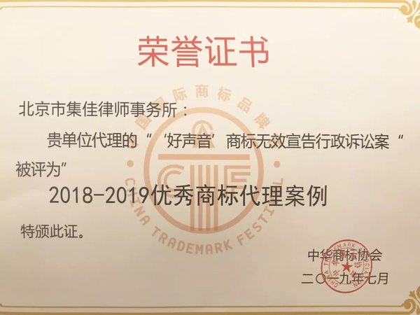 7月6日,第十一屆中國國際商標(biāo)品牌節(jié)在銀川正式拉開帷幕,各項(xiàng)活動如火如荼地進(jìn)行著。在商標(biāo)典型案例評析論壇上,集佳再獲嘉獎,由集佳代理的“好聲音”商標(biāo)無效宣告行政案被評為“2018-2019優(yōu)秀商標(biāo)代理案例”。