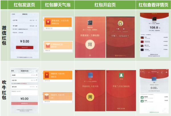 本案緣于被訴“吹?!避浖谔峁┑募t包收發(fā)服務(wù)過(guò)程中,在紅包發(fā)送接收全過(guò)程中使用的紅包發(fā)送頁(yè)、開(kāi)啟頁(yè)、聊天氣泡、查看詳情頁(yè)等界面全面抄襲、模仿原告“微信紅包”相關(guān)界面。此外“吹牛”軟件中還提供與騰訊公司享有在先著作權(quán)的六幅“微信表情”一致的聊天表情,且其使用與“微信”軟件底部界面“聊天、通訊錄、發(fā)現(xiàn)、我”圖標(biāo)高度近似的圖標(biāo)。
