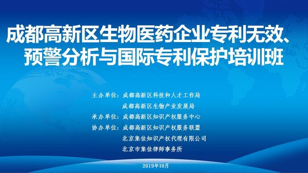 10月24日,由成都高新區(qū)科技和人才工作局、成都高新區(qū)生物產(chǎn)業(yè)發(fā)展局主辦,成都高新區(qū)知識產(chǎn)權(quán)服務(wù)中心承辦,成都高新區(qū)知識產(chǎn)權(quán)服務(wù)聯(lián)盟、北京集佳知識產(chǎn)權(quán)代理有限公司、北京市集佳律師事務(wù)所協(xié)辦的“成都高新區(qū)生物醫(yī)藥企業(yè)專利無效、預警分析與國際專利保護培訓”在高新區(qū)菁蓉匯順利舉行。本次培訓圍繞企業(yè)專利無效、預警分析、海外專利保護等熱點問題展開,旨在增強企業(yè)專利保護能力和意識,助力生物醫(yī)藥企業(yè)海外專利保護、推動生物醫(yī)藥產(chǎn)業(yè)發(fā)展。成都高新區(qū)100 余家知名生物醫(yī)藥企業(yè)、科研院所代表參加培訓。