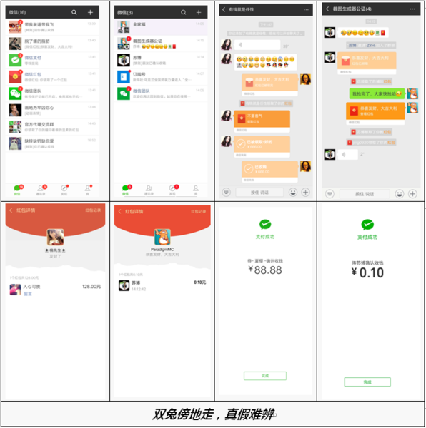 近年來(lái),移動(dòng)應(yīng)用市場(chǎng)上出現(xiàn)一系列以智能生成騰訊微信軟件界面截圖為功能賣(mài)點(diǎn)的移動(dòng)應(yīng)用。此種應(yīng)用復(fù)制微信各功能界面的美術(shù)素材并提供相應(yīng)的編輯模塊,使其使用者可通過(guò)編輯數(shù)據(jù)內(nèi)容快速、大量生成包括微信對(duì)話記錄、微信紅包記錄、微信支付記錄等多種虛假微信截圖。