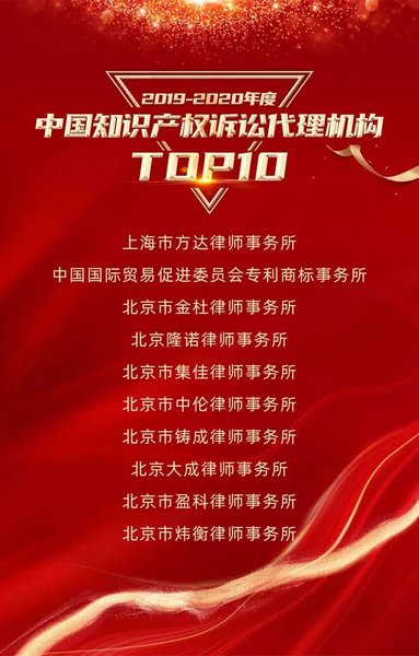 2020年12月2日,知識產(chǎn)權(quán)領(lǐng)域權(quán)威媒體知產(chǎn)力與知產(chǎn)寶重磅推出“2019-2020年度中國知識產(chǎn)權(quán)訴訟代理機(jī)構(gòu)TOP 10”排行榜,北京市集佳律師事務(wù)所憑借其優(yōu)質(zhì)的服務(wù)、卓越的業(yè)務(wù)能力和處理疑難案件的突出能力,榮登TOP10榜單!