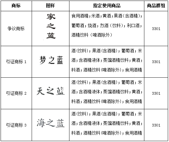 洋河公司針對下述“家之藍(lán)”商標(biāo)提出了無效宣告,主要的理由是認(rèn)為“家之藍(lán)”與引證商標(biāo)“夢之藍(lán)”“天之藍(lán)”“海之藍(lán)”近似。