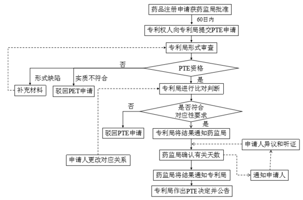 1)PTE申請人(專利權(quán)人)在收到藥監(jiān)局上市批準的規(guī)定時限內(nèi)(例如60日)向?qū)@痔峤籔TE申請;