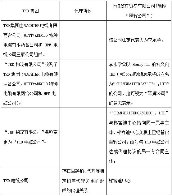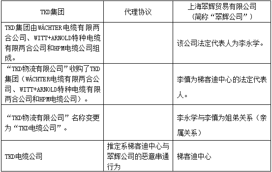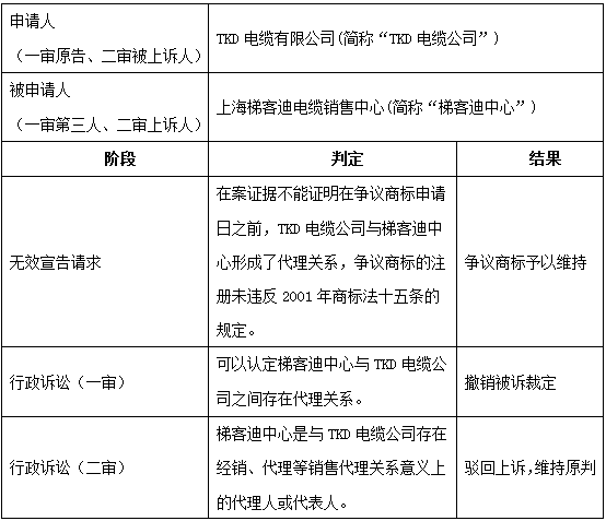 可知,該案雙方雖然不屬于直接的代理關系(即無法簡單通過代理、經(jīng)銷合同以及交易憑證、采購資料等就直接體現(xiàn)雙方的代理或經(jīng)銷關系),但通過關系的梳理及以多份證據(jù)共同形成證據(jù)鏈,一方面可證明梯客迪中心實質(zhì)上已經(jīng)替代翠輝公司,成為與TKD電纜公司達成代理協(xié)議的另一方合同主體,從而可以認定雙方存在代理關系;另一方面,也可證明梯客迪中心和翠輝公司的法定代表人為親屬關系,從而推定其之間具有串通合謀行為。由此,法院認定該案雙方之間存在代理關系,并適用《商標法》第十五條第一款對其予以規(guī)制。
